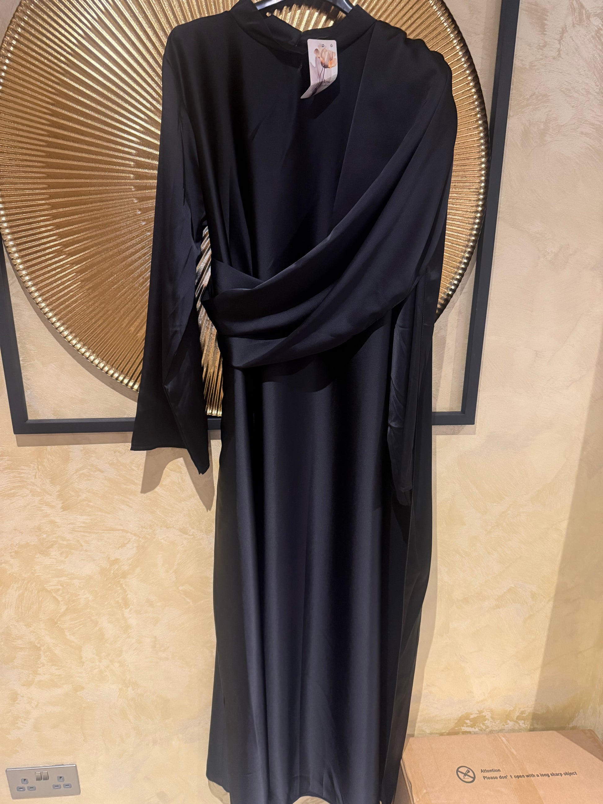 one-sided draped abaya features a sleek, modern silhouette with an elegant cascading panel for effortless sophistication. Crafted from smooth, flowy fabric, it includes a detachable belt to cinch the waist for a more defined and flattering fit. Designed as a versatile one-size piece that suits most body types, it’s the perfect choice for evenings, celebrations, and special occasions where understated luxury makes the statement.