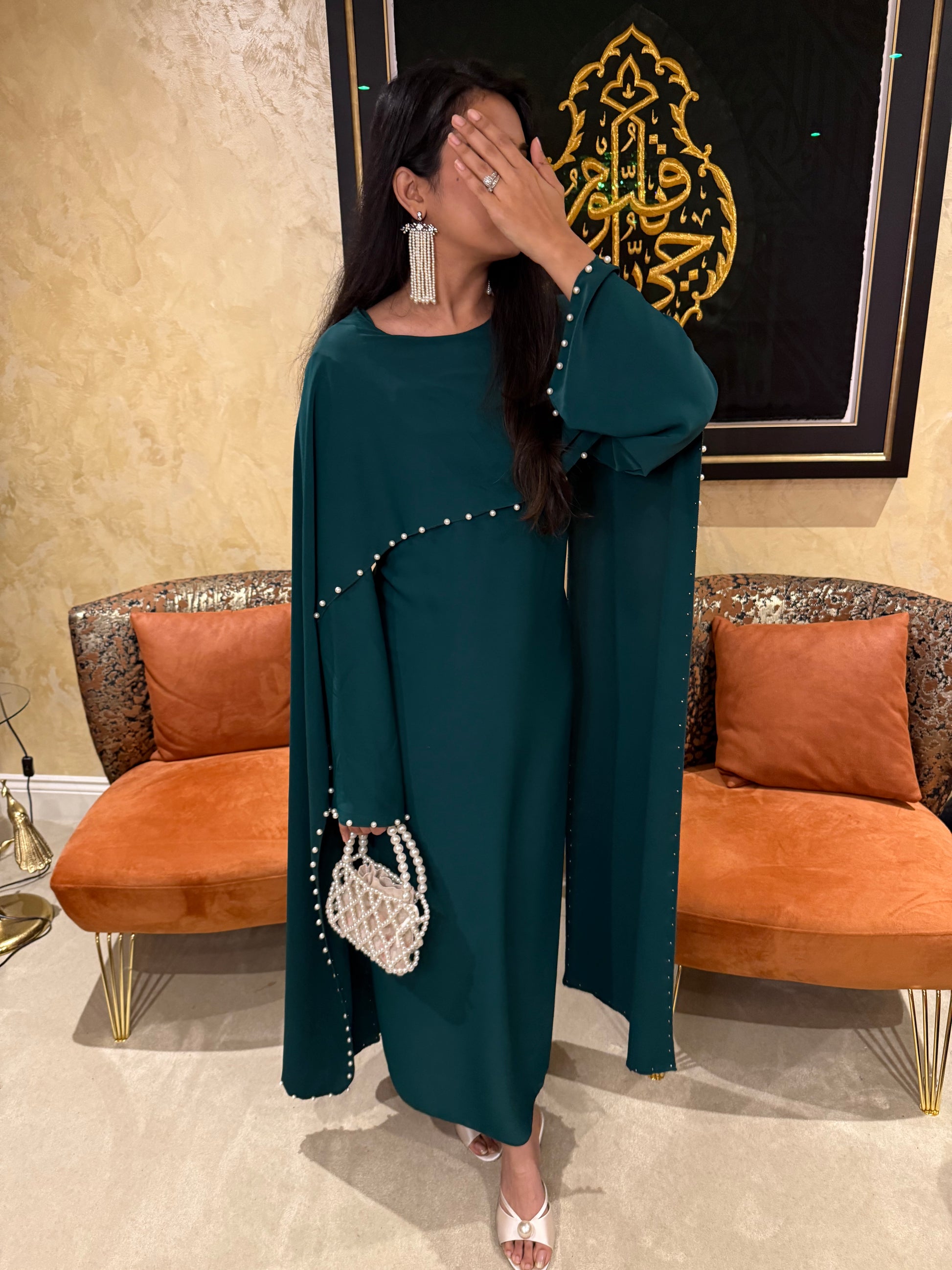 elegant emerald-green dress features flowing cape sleeves and delicate pearl embellishments for a luxurious, refined finish. Crafted from soft, lightweight fabric, it drapes beautifully to offer a modest yet chic silhouette. Comes with a belt to give more fitted look.